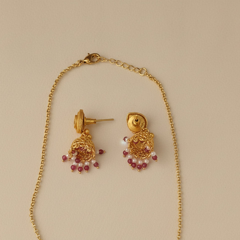 Pastel Bead Accents • Subtle Red Drop Detailing • Detailed Pendant Design • Gold-Toned Chain • Matching Earrings • Elegant Festive Fusion Appeal