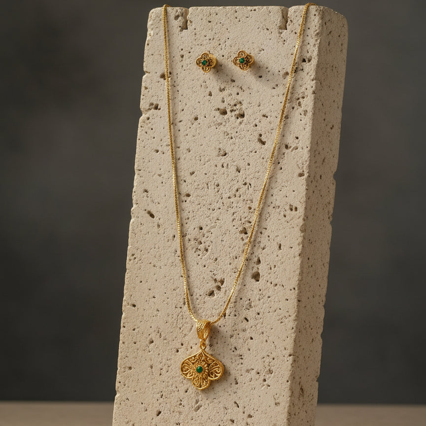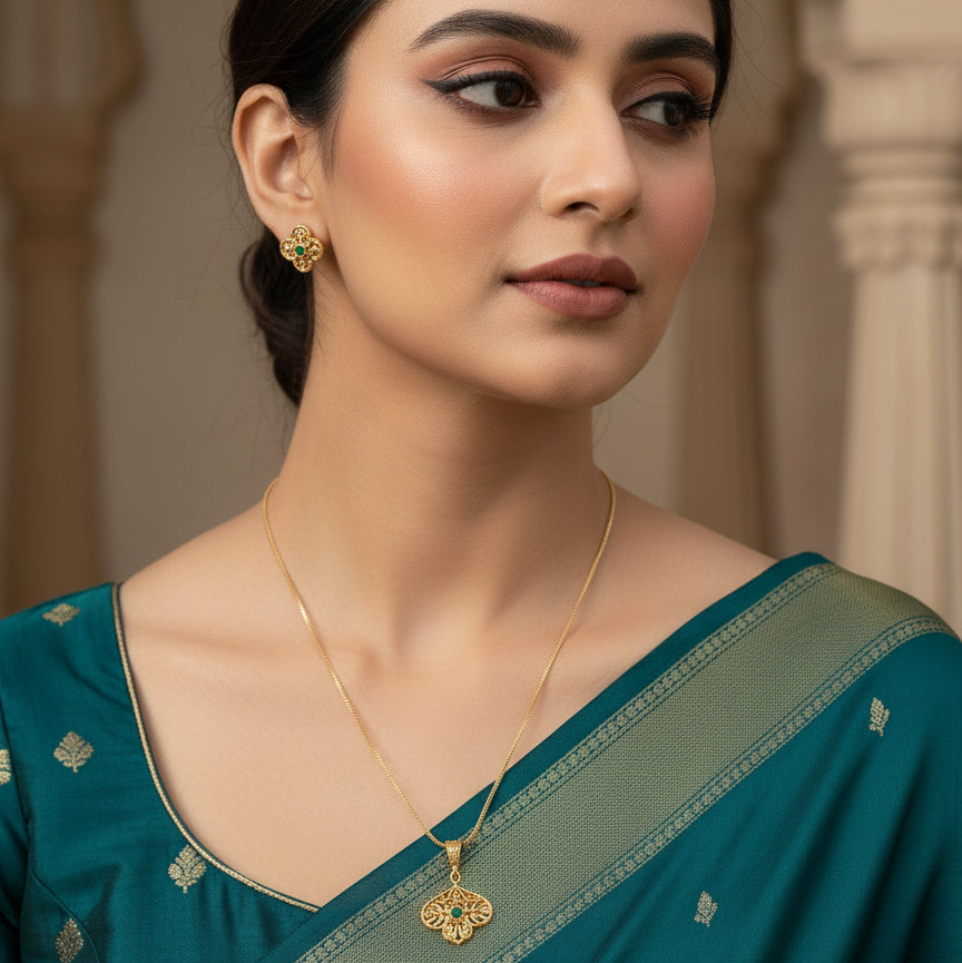 A graceful gold-toned necklace set featuring an intricately carved floral-inspired pendant with a green stone centre and matching stud earrings, designed for understated elegance in ethnic and fusion wear.