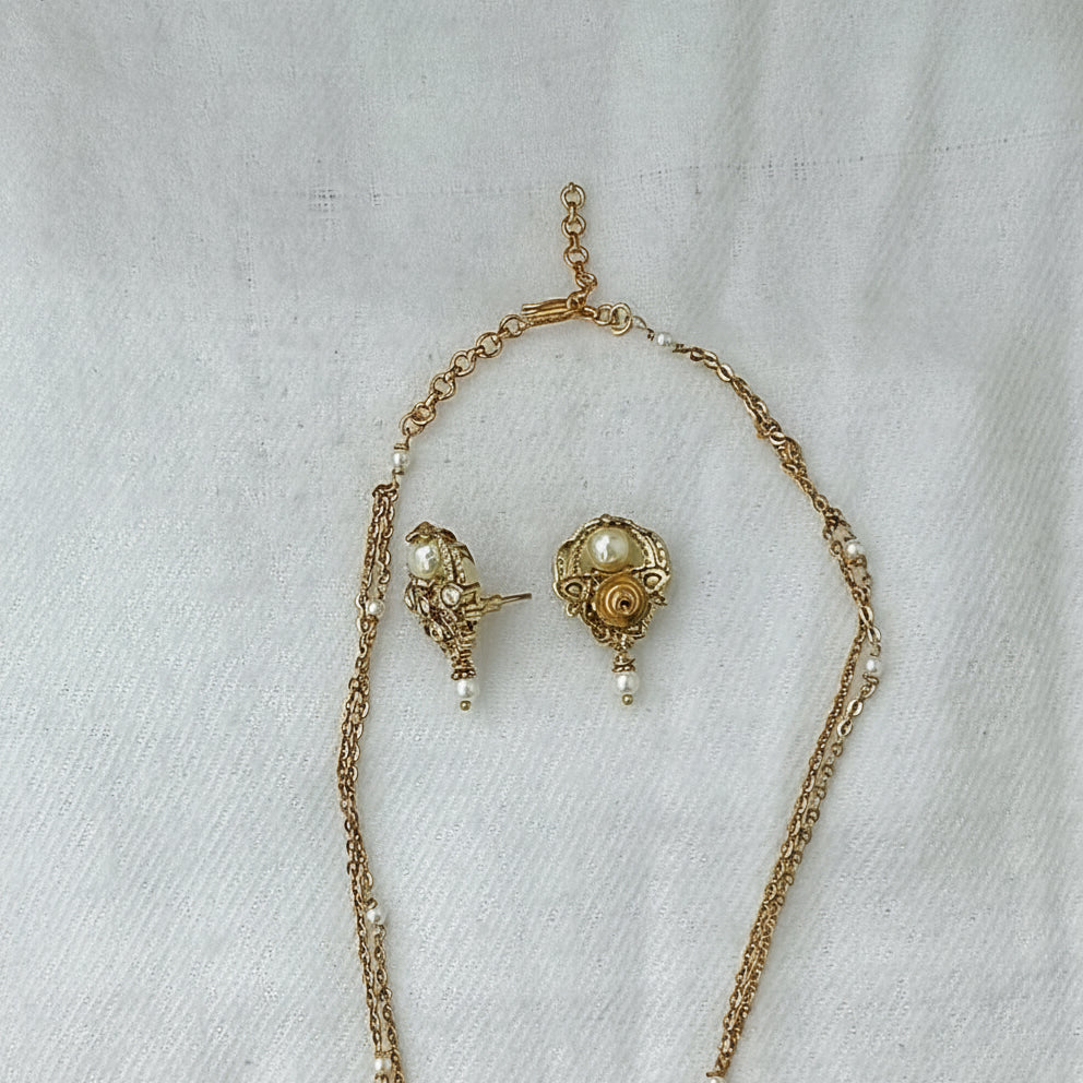 Add a touch of royal elegance to your look with this stunning gold-toned necklace set featuring a beautifully detailed pendant adorned with pearl and CZ accents. Paired with matching earrings, this lightweight and classy set is perfect for elevating both festive and traditional outfits with effortless grace.