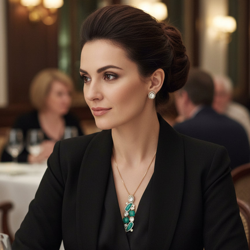 Add effortless elegance to your look with this gold-toned pendant necklace set featuring emerald-green stones and sparkling white crystals. Lightweight, modern, and perfect for festive, casual, and fusion outfits, this jewellery brings a refined pop of colour to any occasion.