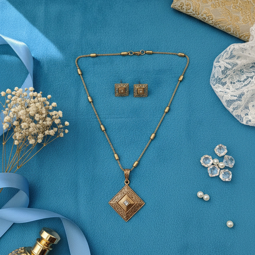 Enhance your everyday style with this elegant antique gold geometric pendant necklace set, featuring a finely detailed square-cut pendant with matching studs and a stylish beaded chain. Perfect for both casual and ethnic looks, this lightweight set adds a touch of modern elegance and traditional charm to any outfit.