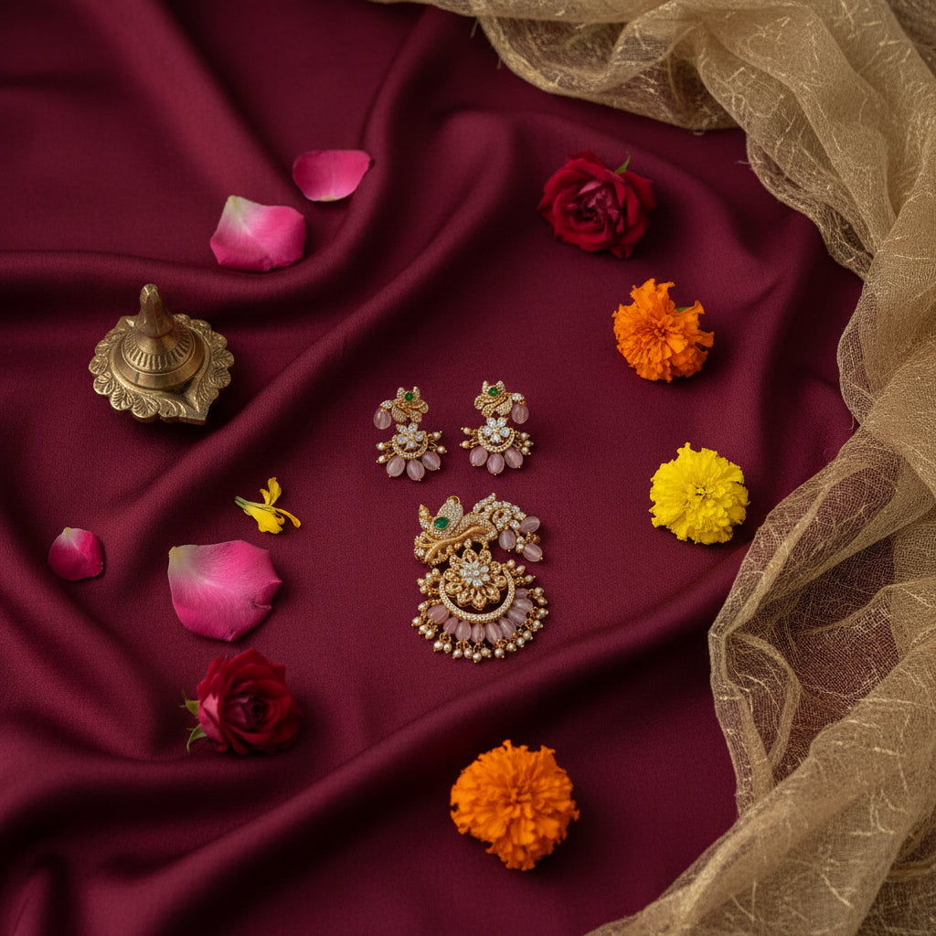 Add a royal touch to your festive look with this peacock-inspired gold-toned pendant set, featuring intricate floral detailing, sparkling stones, and elegant bead accents. The beautifully crafted pendant paired with matching earrings creates a graceful blend of tradition and statement style. The pendant can be worn with any type of chain, gold chain, pearl mala, or suitable contrast / matching beads mala, making it a versatile addition to your jewelry collection—perfect for weddings, festive occasions, and cultural celebrations.