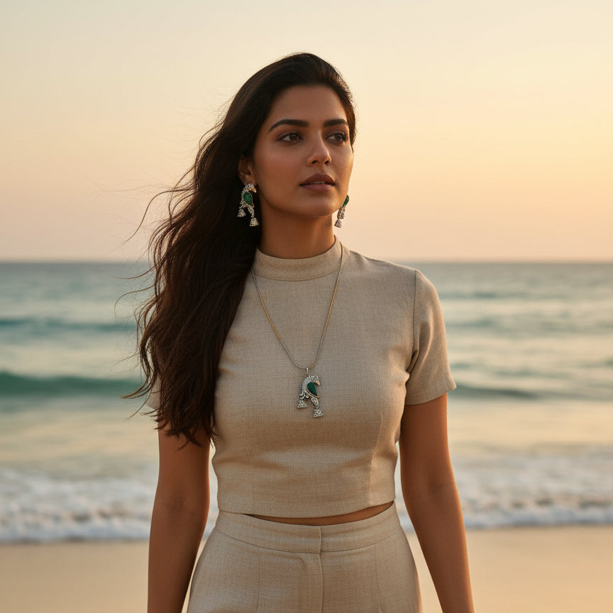Pair it with a solid kurti, boho dress, or printed saree, and style your hair in a half-tie or soft waves to let the parrot motif stand out. Add minimal bangles or studs to keep the look balanced.