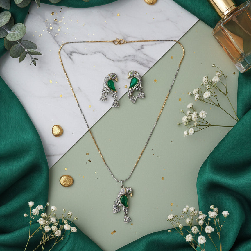 A unique gold-toned necklace set featuring an elegant parrot-shaped pendant and matching earrings, embellished with sparkling stones and enamel accents for a stylish ethnic-fusion look. Perfect for festive and casual occasions.