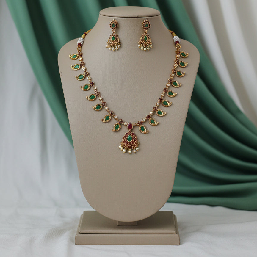 A traditional gold-toned necklace set adorned with green paisley motifs, red stone detailing, and a classic dangler pendant, crafted to elevate festive and ethnic looks with timeless elegance.