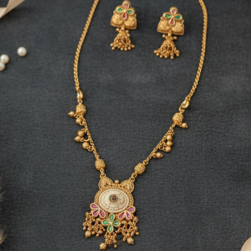 Heritage-Inspired Pendant • Green & Pink Stone Accents • Intricate Motif Detailing • Delicate Hanging Elements • Gold-Toned Finish • Matching Drop Earrings • Classic Ethnic Elegance