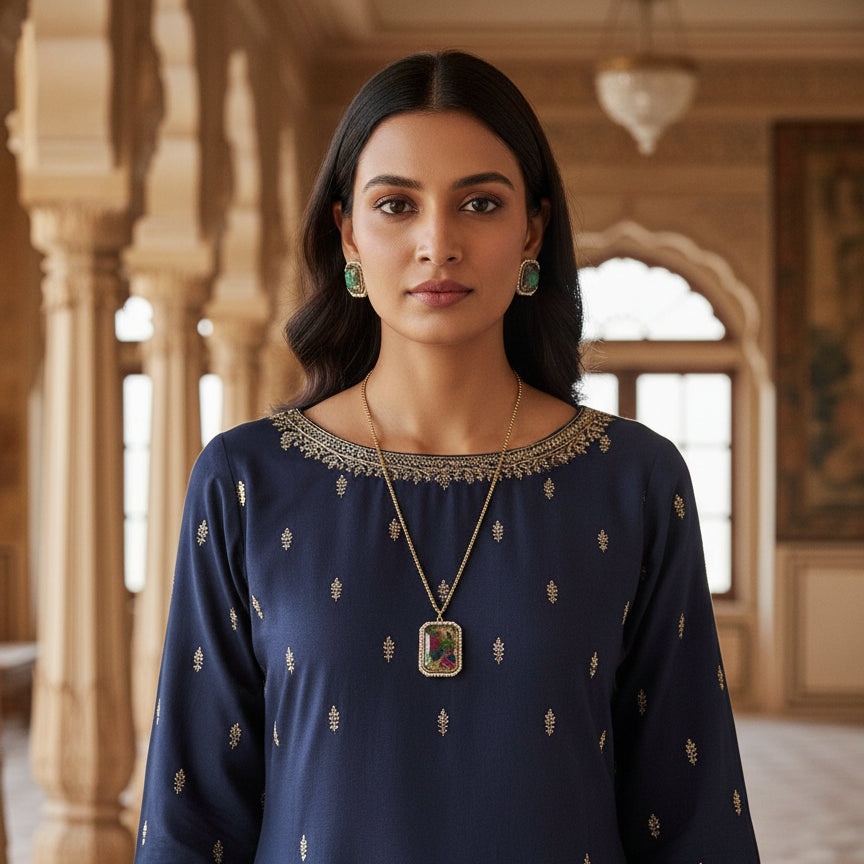 Pair this colourful mosaic pendant set with solid kurtis, pastel suits, or flowy maxi dresses to let the vibrant stones stand out. For a chic fusion vibe, style it with a plain white shirt and jeans or a solid jumpsuit. Finish the look with a sleek ponytail or soft curls to highlight the earrings.