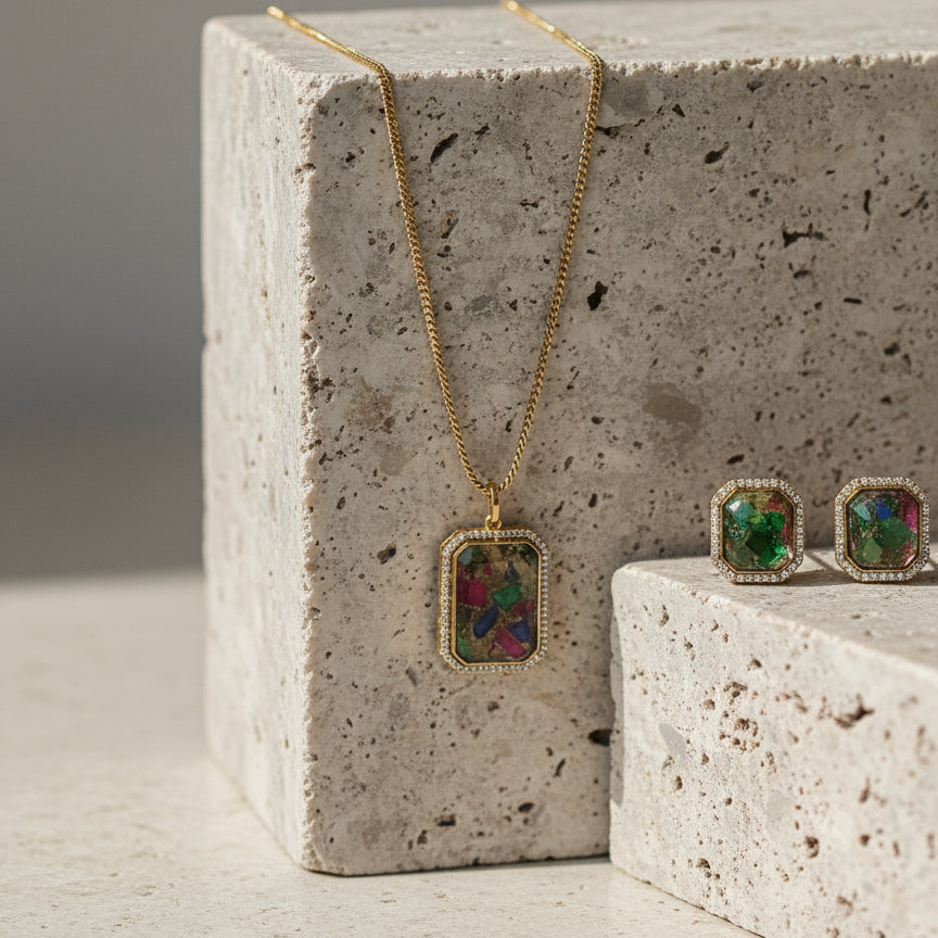 Bring vibrant elegance to your look with this gold-toned necklace set featuring a colourful mosaic-style stone pendant and matching earrings. The multi-shade stones framed with a delicate gold border add a unique fusion charm, making it perfect for both festive and casual styling. Lightweight, eye-catching and versatile, this set instantly elevates any outfit.