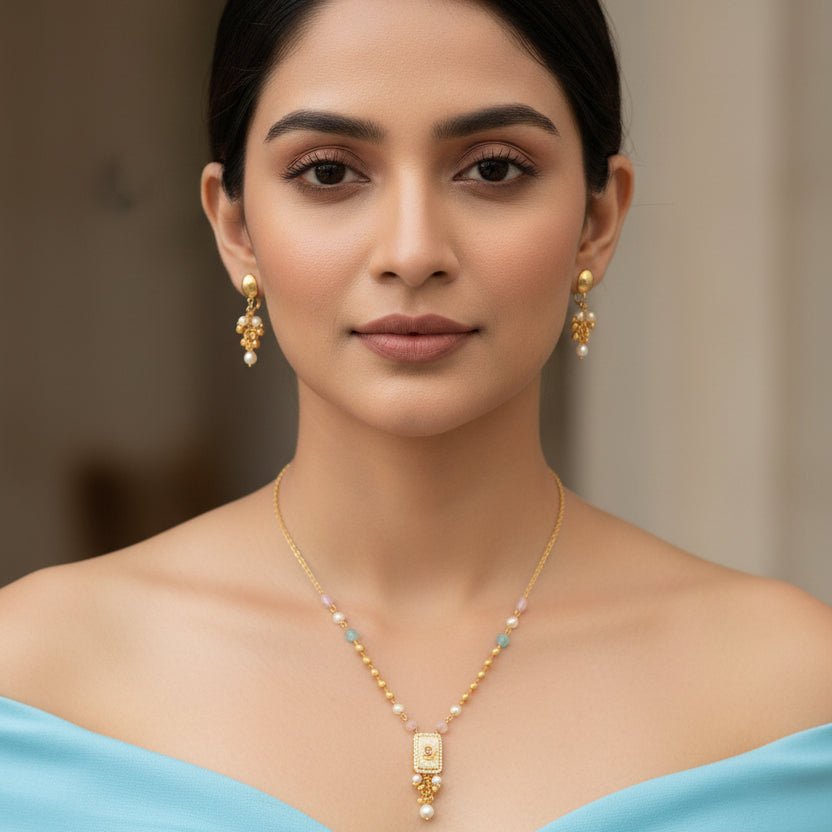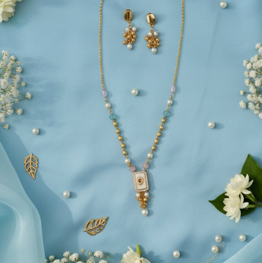 Rectangular Pendant Design • Subtle Stone Detailing • Pastel Bead Accents • Pearl Drop Finish • Gold-Toned Chain • Matching Earrings • Elegant & Lightweight Appeal