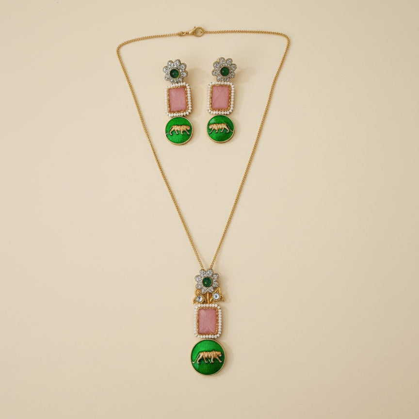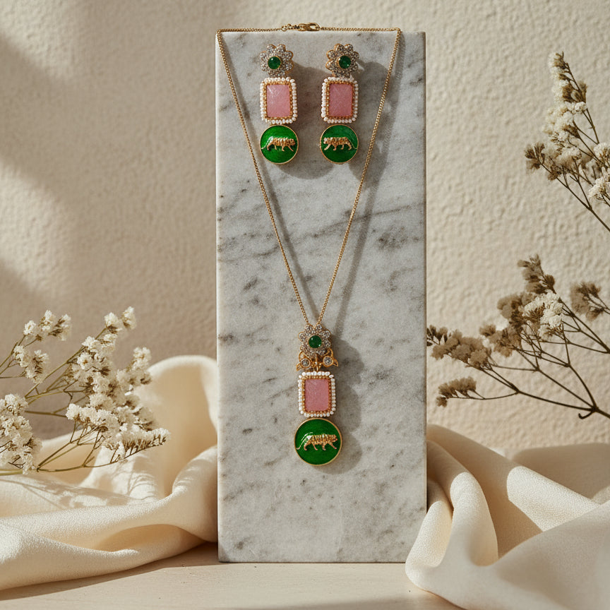 Gold finish • Pink stone • Green enamel tiger motif • CZ detailing • Lightweight set • Matching earrings