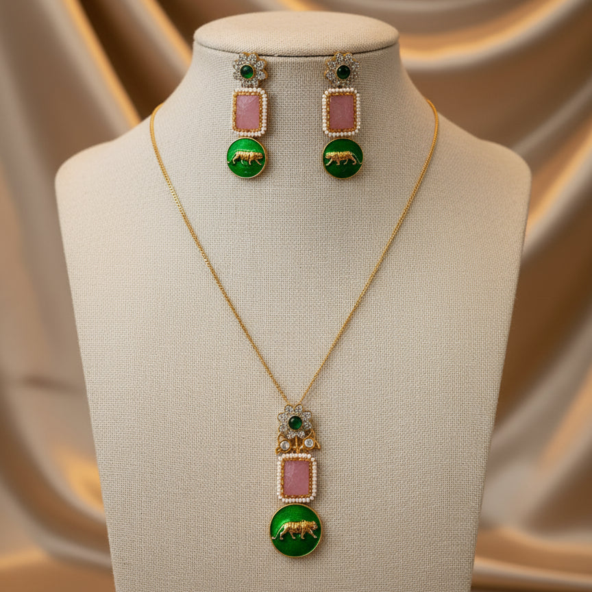 Enhance your festive and fusion outfits with this elegant gold-toned pendant set featuring a pink stone centrepiece, green enamel tiger motif, and sparkling CZ detailing. Paired with matching earrings, this lightweight set adds a unique, statement touch to sarees, kurtas and Indo-western looks.