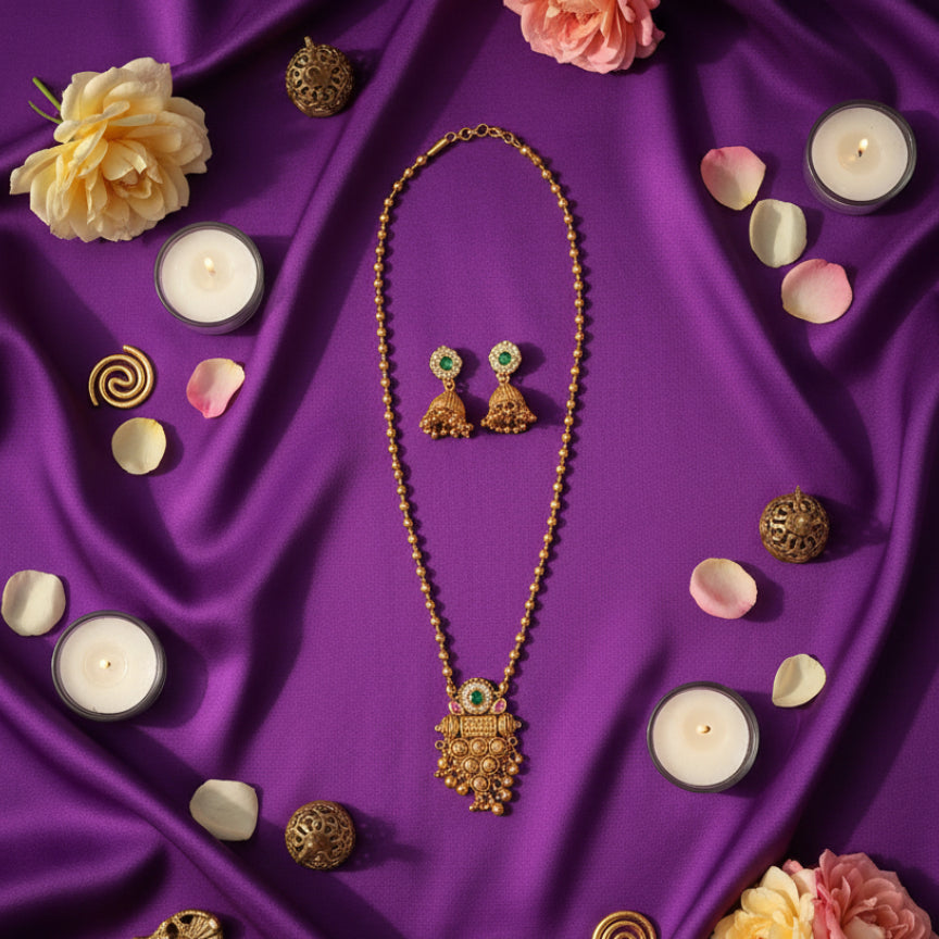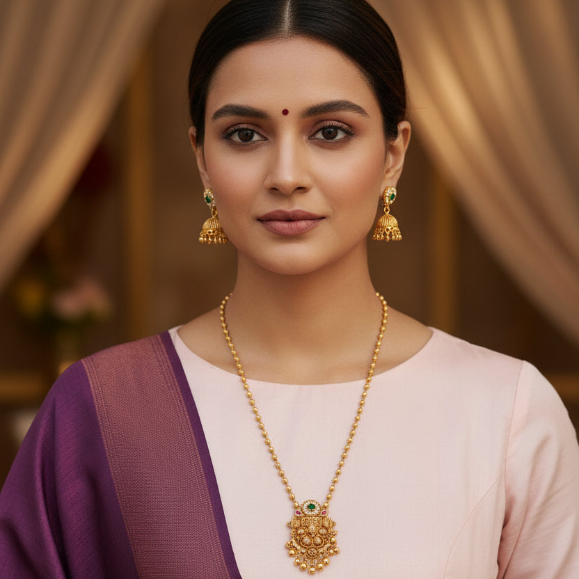 • Pair with traditional sarees, half-sarees, or ethnic suits to complement its heritage design • Style hair in a middle-parted bun, classic braid, or neatly pinned hairstyle to showcase the matching jhumkis • Keep the neckline simple and non-heavy so the pendant and beaded chain remain the focal highlight