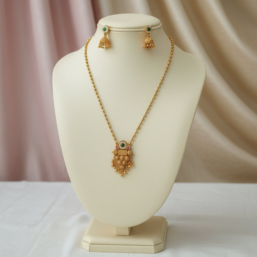 Heritage-Inspired Pendant • Green Stone Highlights • Intricate Detailing • Beaded Chain Design • Gold-Toned Finish • Matching Jhumki Earrings • Classic Traditional Appeal