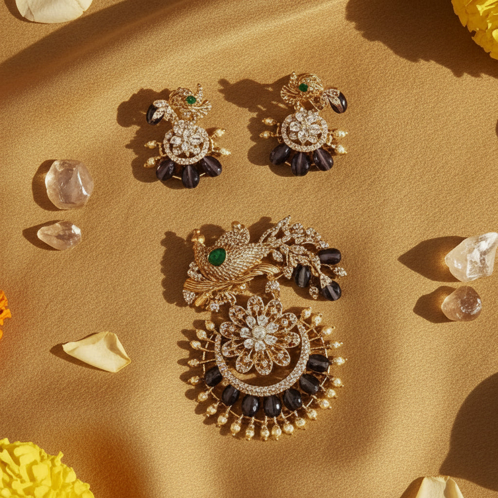 Highlights: • Peacock Motif Design • Gold-Toned Finish • Floral Stone Detailing • Elegant Bead Accents • Matching Earrings Included • Can Be Worn with Any Chain or Suitable Contrast / Matching Beads mala • Traditional Yet Statement Look • Lightweight & Comfortable to Wear