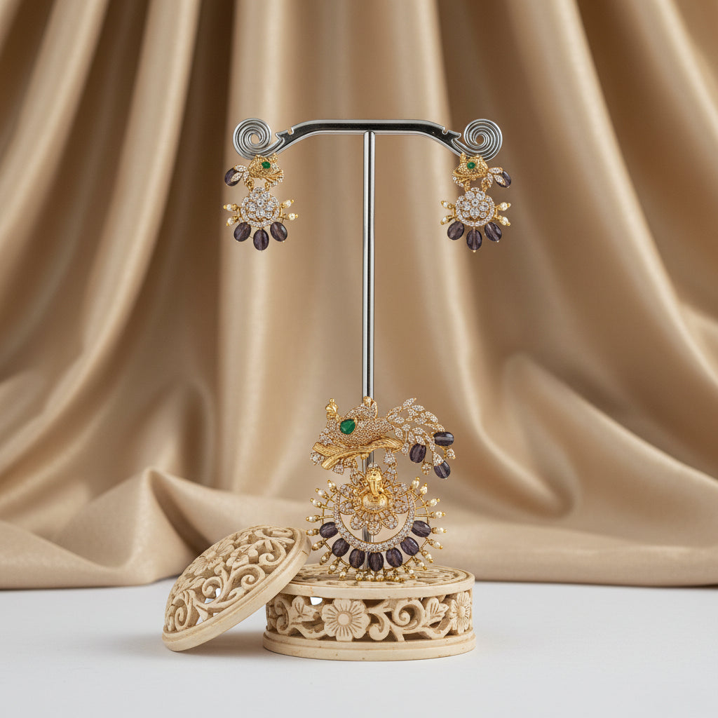 Add a royal touch to your festive look with this peacock-inspired gold-toned pendant set, featuring intricate floral detailing, sparkling stones, and elegant bead accents. The beautifully crafted pendant paired with matching earrings creates a graceful blend of tradition and statement style. The pendant can be worn with any type of chain, gold chain, pearl mala, or suitable contrast / matching beads mala, making it a versatile addition to your jewelry collection—perfect for weddings, festive occasions, and cultural celebrations.