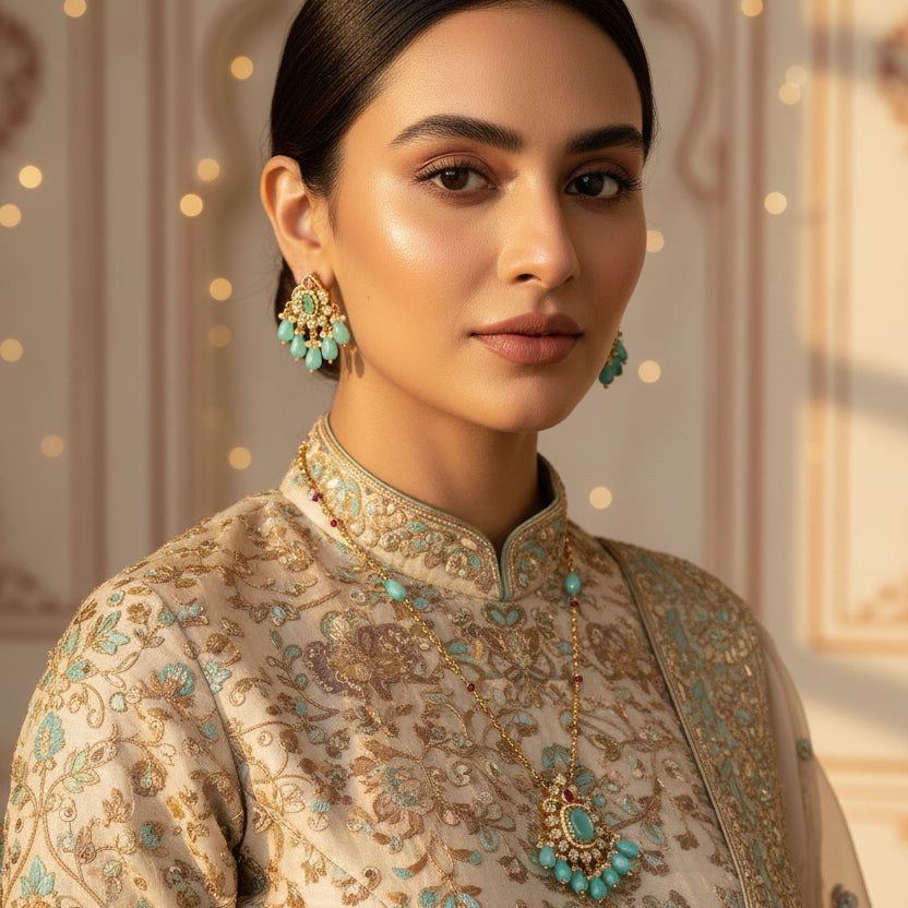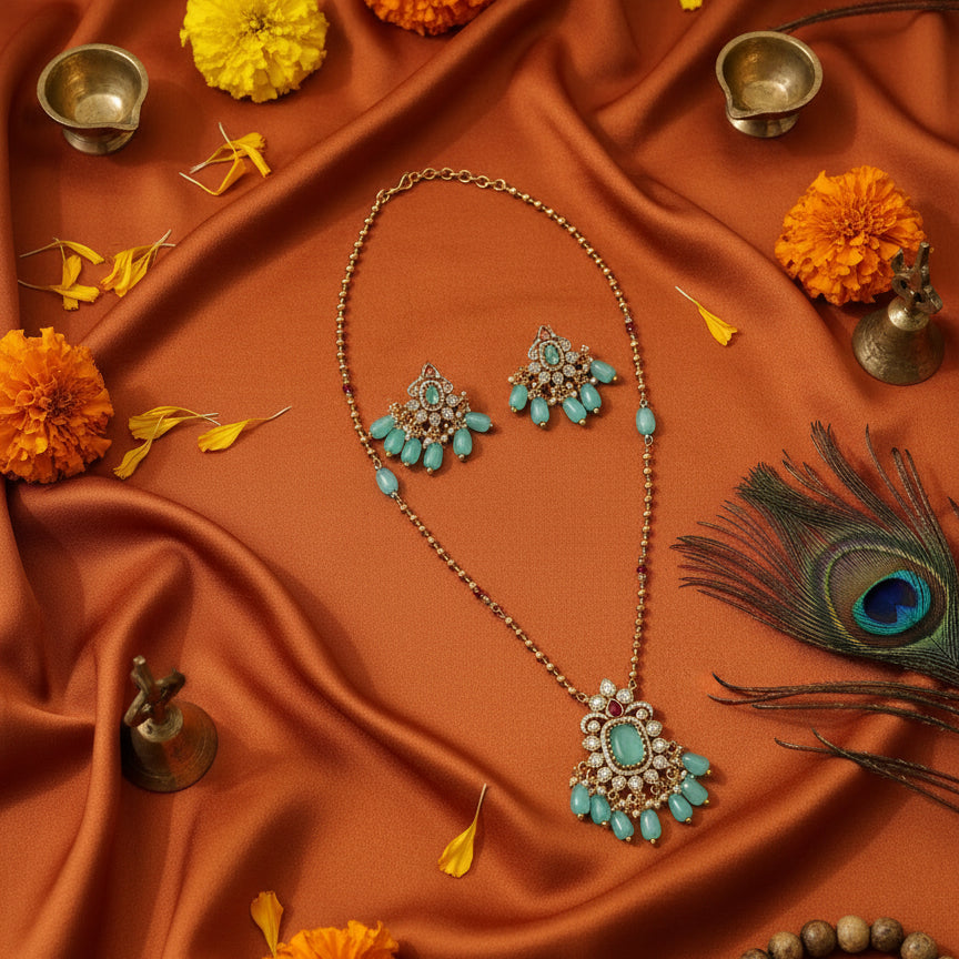 • Pair with silk sarees, lehengas, or traditional suits to highlight the statement pendant • Choose turquoise, green, maroon, cream, or gold outfits to complement the bead color • Style your hair in a bun or soft curls to draw attention to the neckline and earrings • Keep the rest of your accessories minimal, letting this necklace set be the focal point