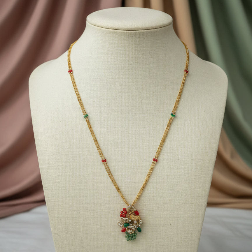 Add a vibrant ethnic touch to your jewellery collection with this gold-toned long necklace featuring a beautifully detailed pendant accented with red and green bead drops. The delicate chain with subtle bead detailing makes it a perfect blend of traditional charm and everyday elegance.
