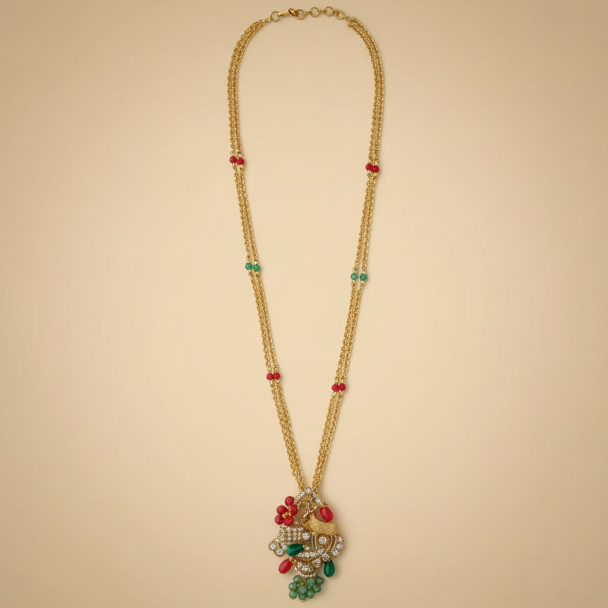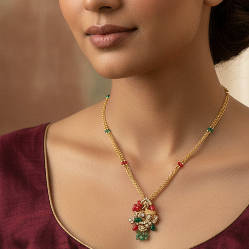 Gold-Toned Finish • Red & Green Bead Accents • Ornate Pendant Design • Traditional Appeal • Lightweight & Comfortable • Versatile Styling