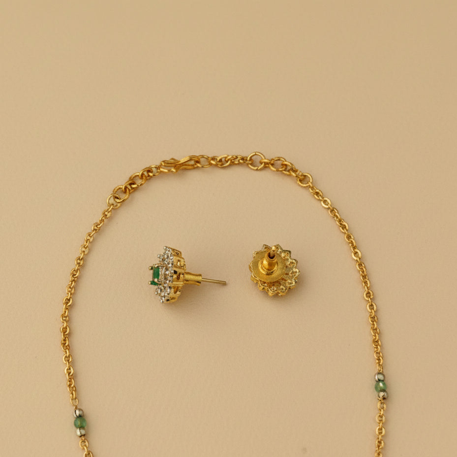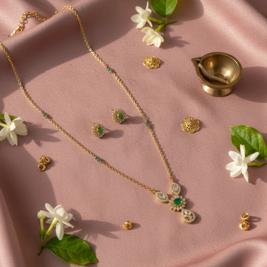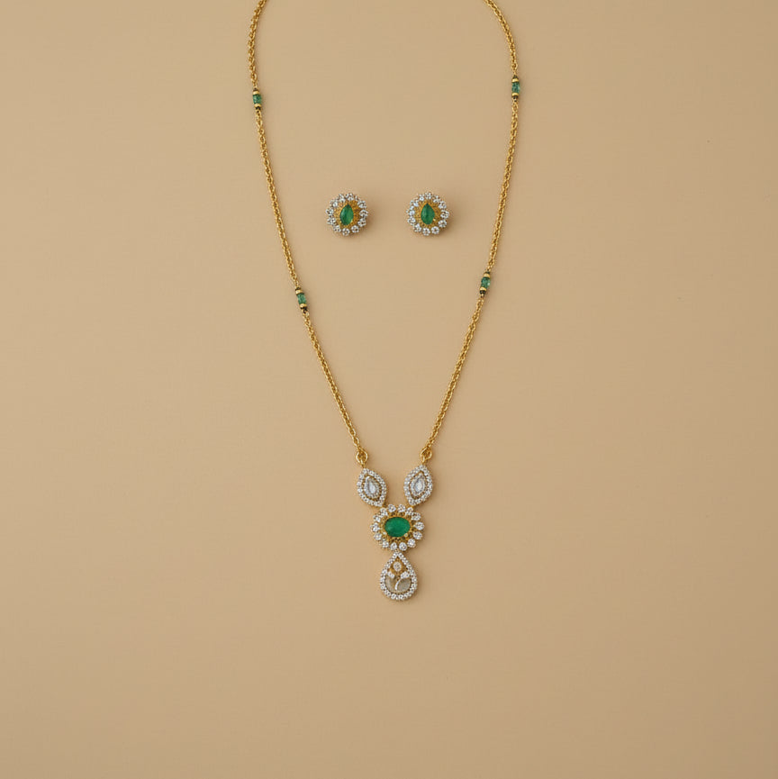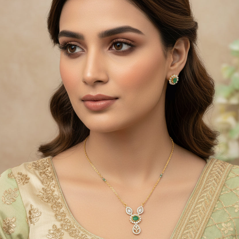 Green Stone Pendant • CZ Sparkle • Gold-Toned Finish • Elegant Design • Matching Earrings • Lightweight & Comfortable